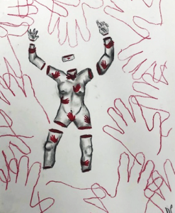 Collette was a young adult patient who struggled with an eating disorder, trauma, borderline personality disorder, depression, and anxiety. She also experienced dissociation while in distress. She created a playlist to help with grounding when she felt disconnected from herself and the world around her. Her art response began with a drawing that centered a severed body with no head or feet and small red handprints all over (Image 5). She told us that this represented the crux of her pain and the psychological response of splitting off from parts of herself. Collette also represented the emotional transition to baseline by tracing her own hands around the page, noting that this signified being more grounded and connected with her body.